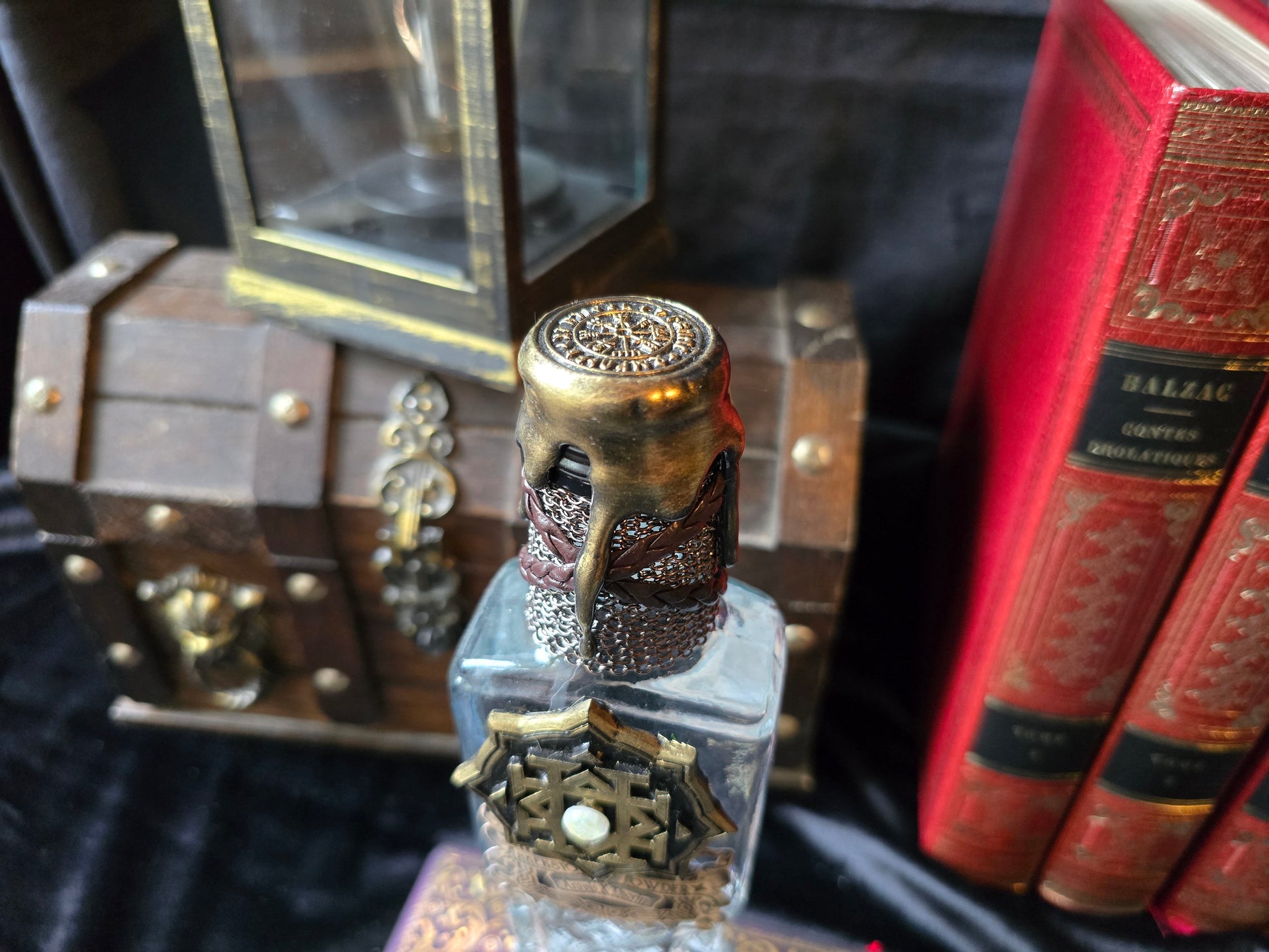 - De la chaine est enroulée sur le haut de la fiole ainsi que du simili cuir tressé.