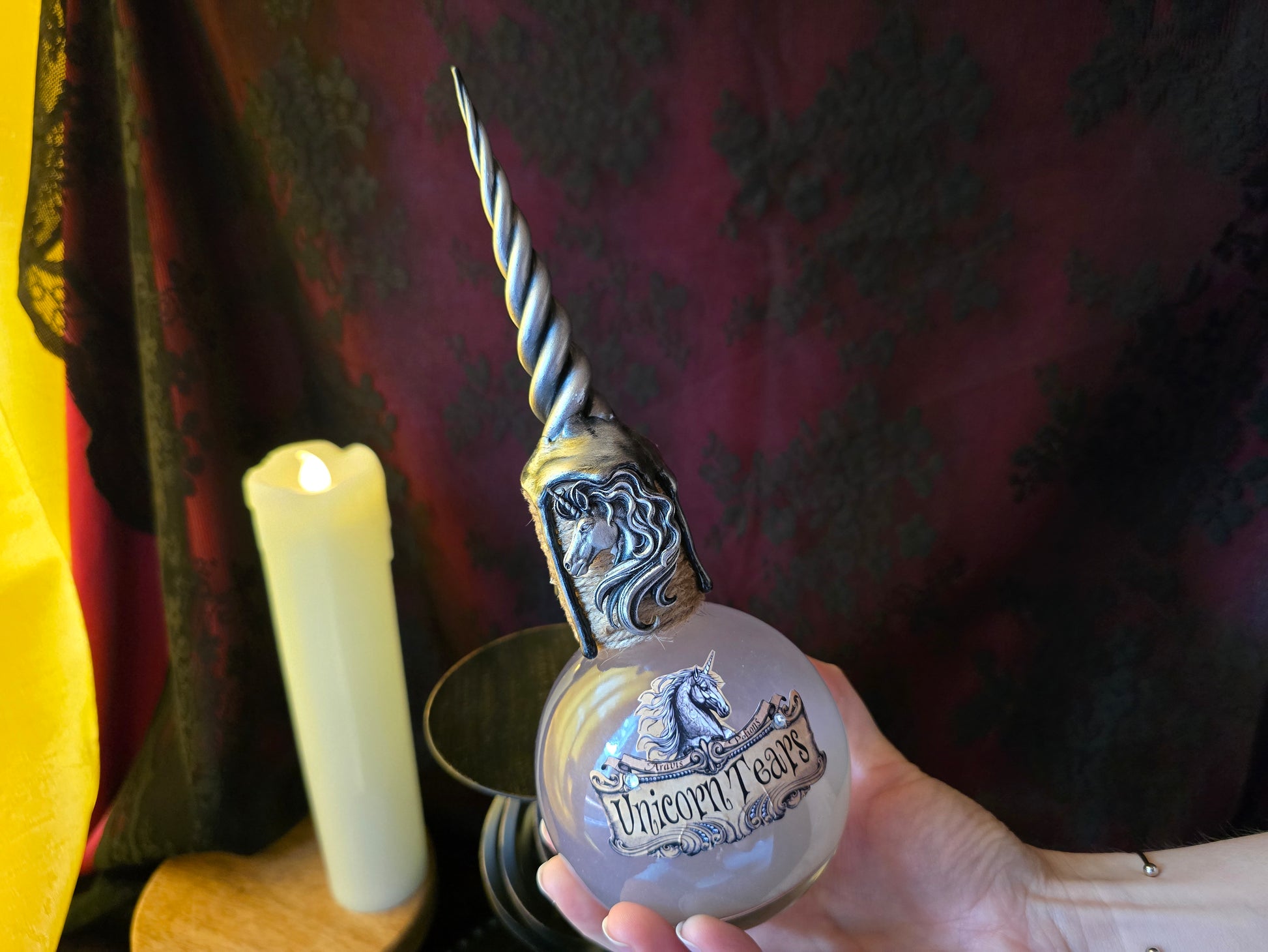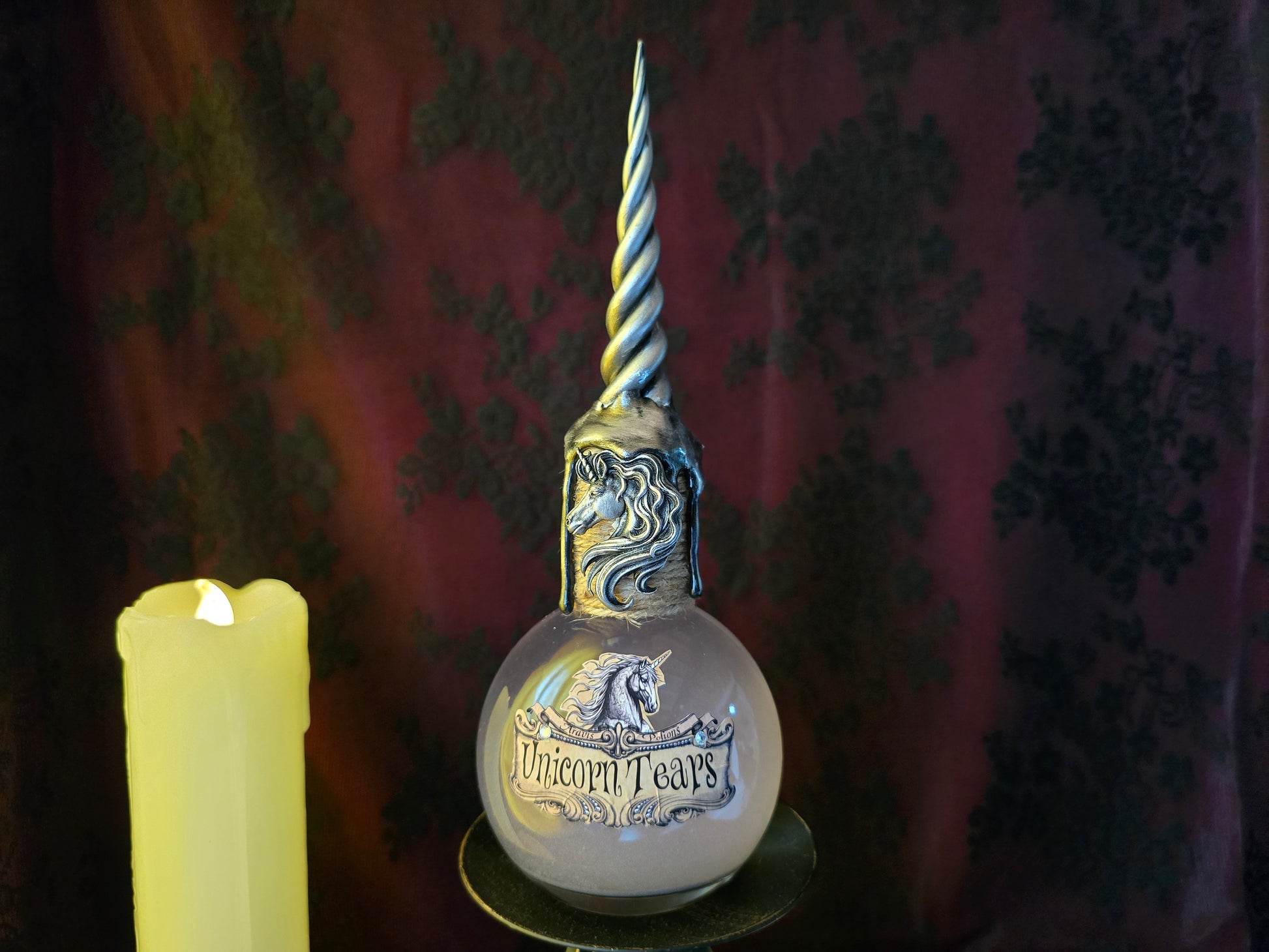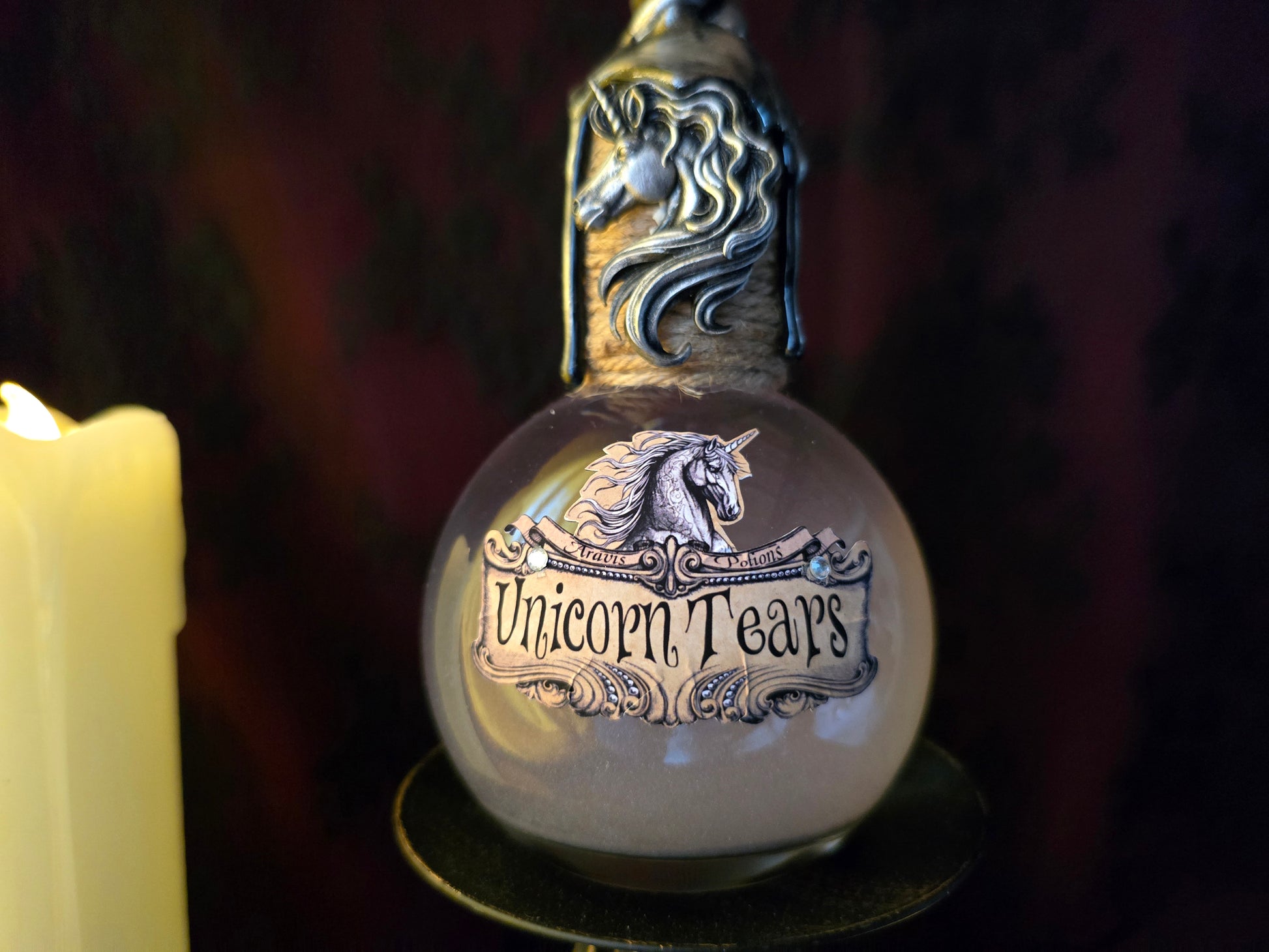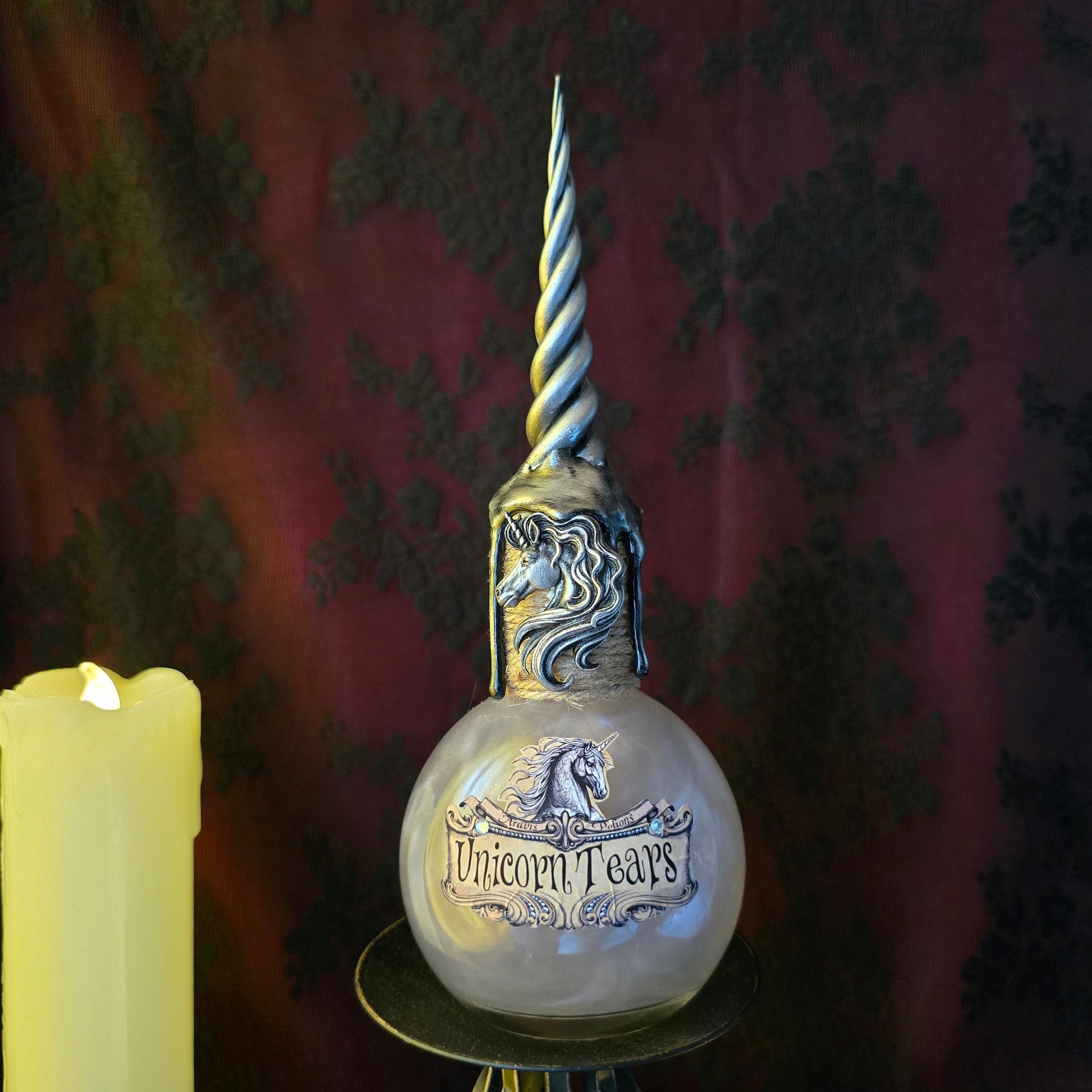 - Un charm de licorne est fixé sur la fiole. -- Une corne argentée en résine peinte à la main orne le haut de la fiole.