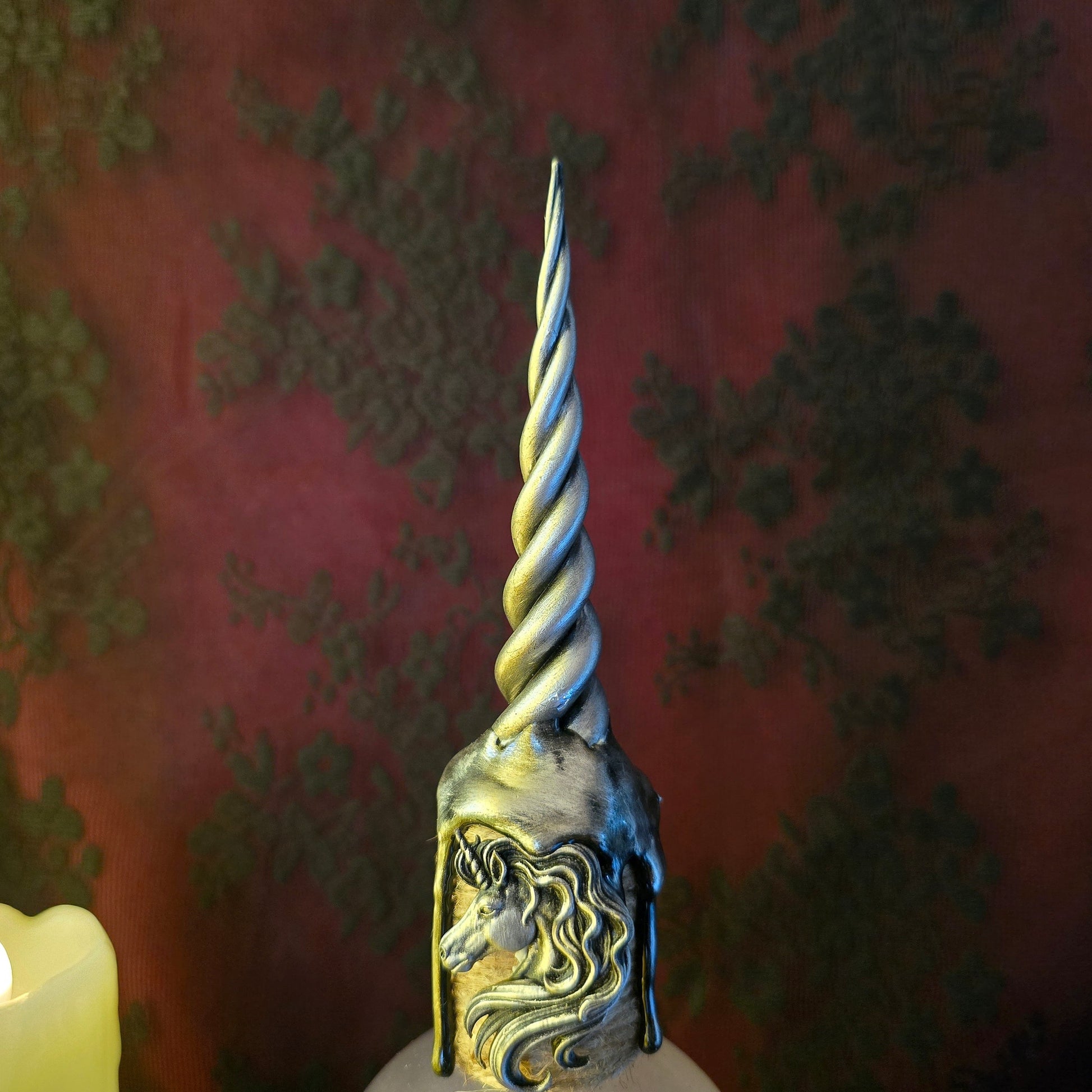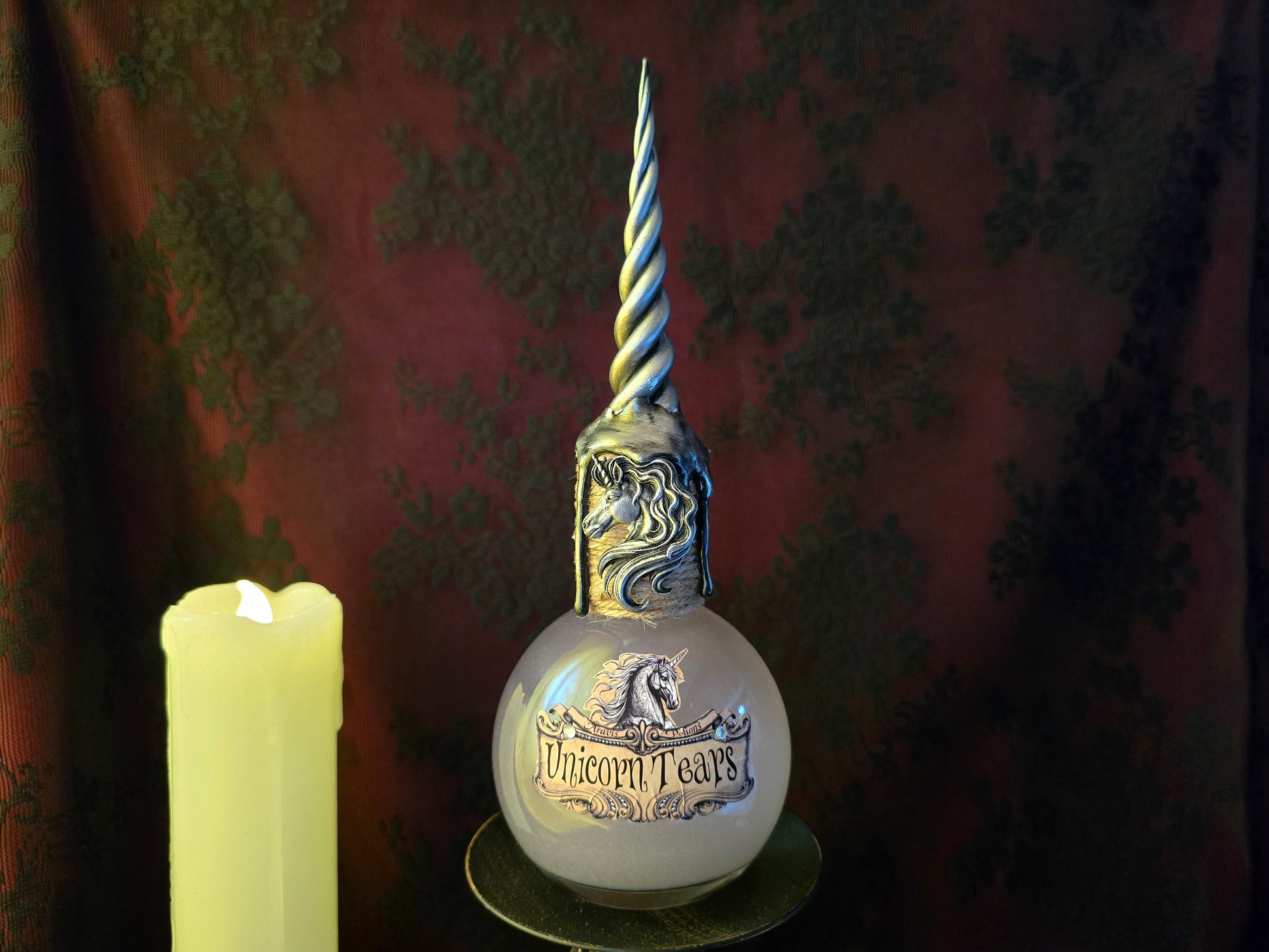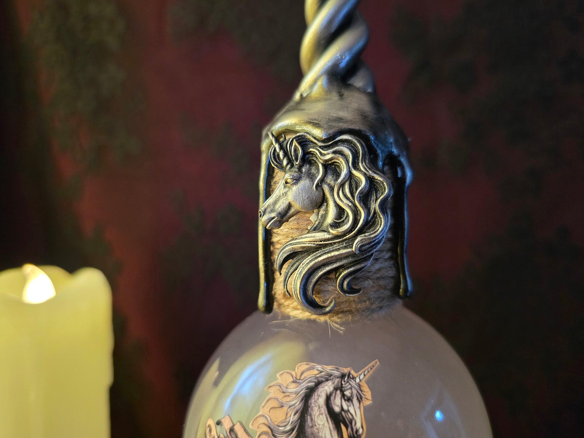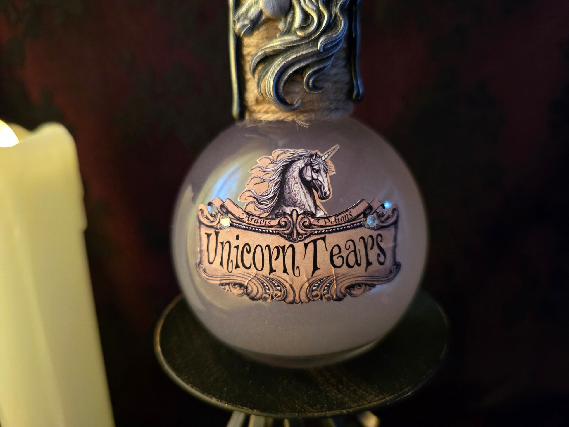 - Un charm de licorne est fixé sur la fiole. -- Une corne argentée en résine peinte à la main orne le haut de la fiole.