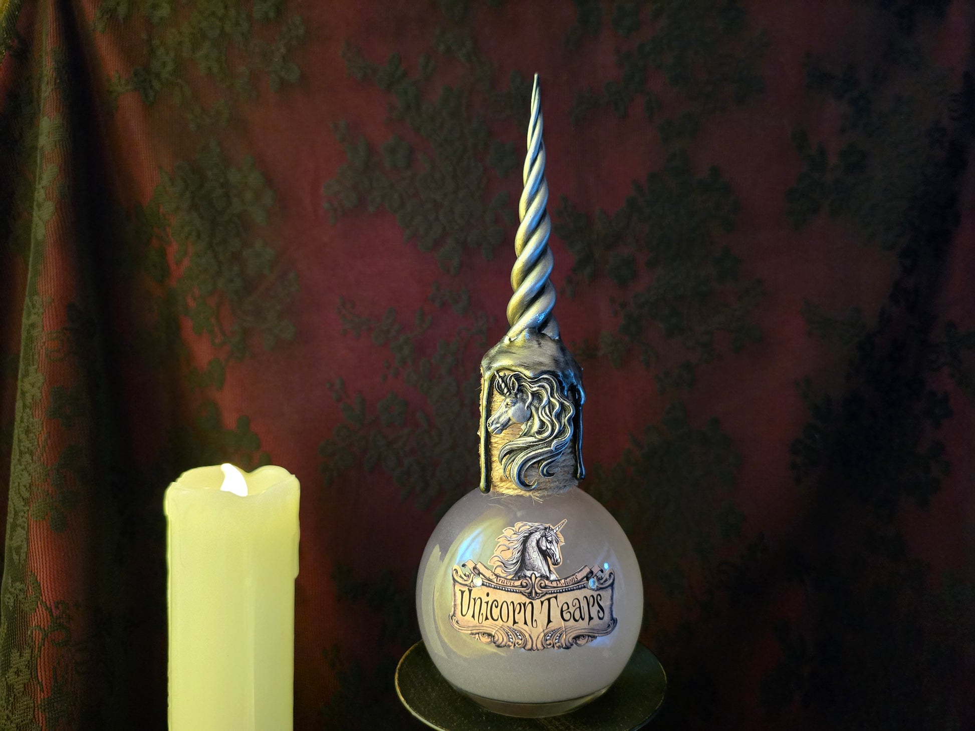 Larmes de Licorne, Unicorn tears - potion magique de sorcier, bouteille en verre de décoration, fiole d’apothicaire, alchimiste.