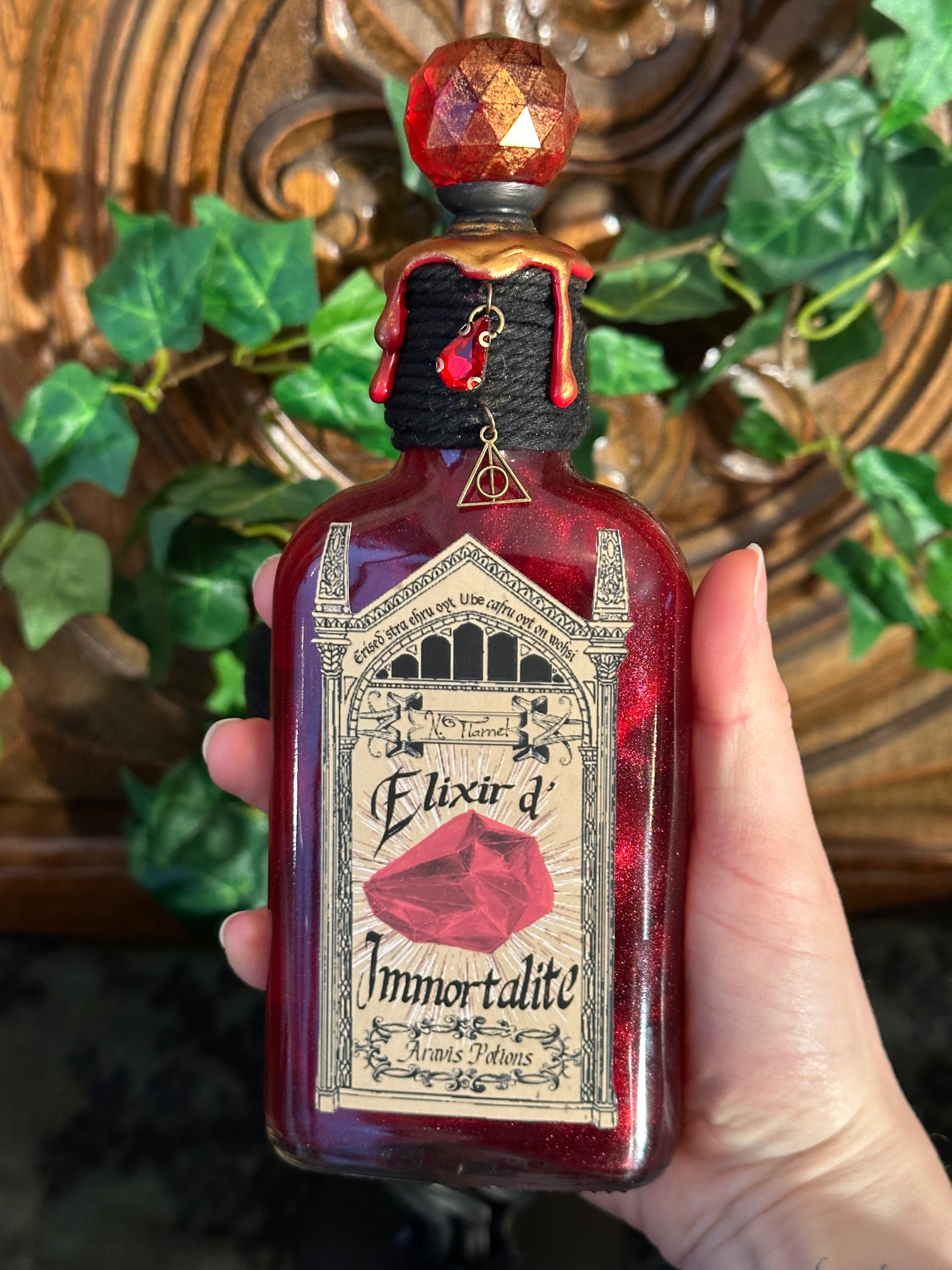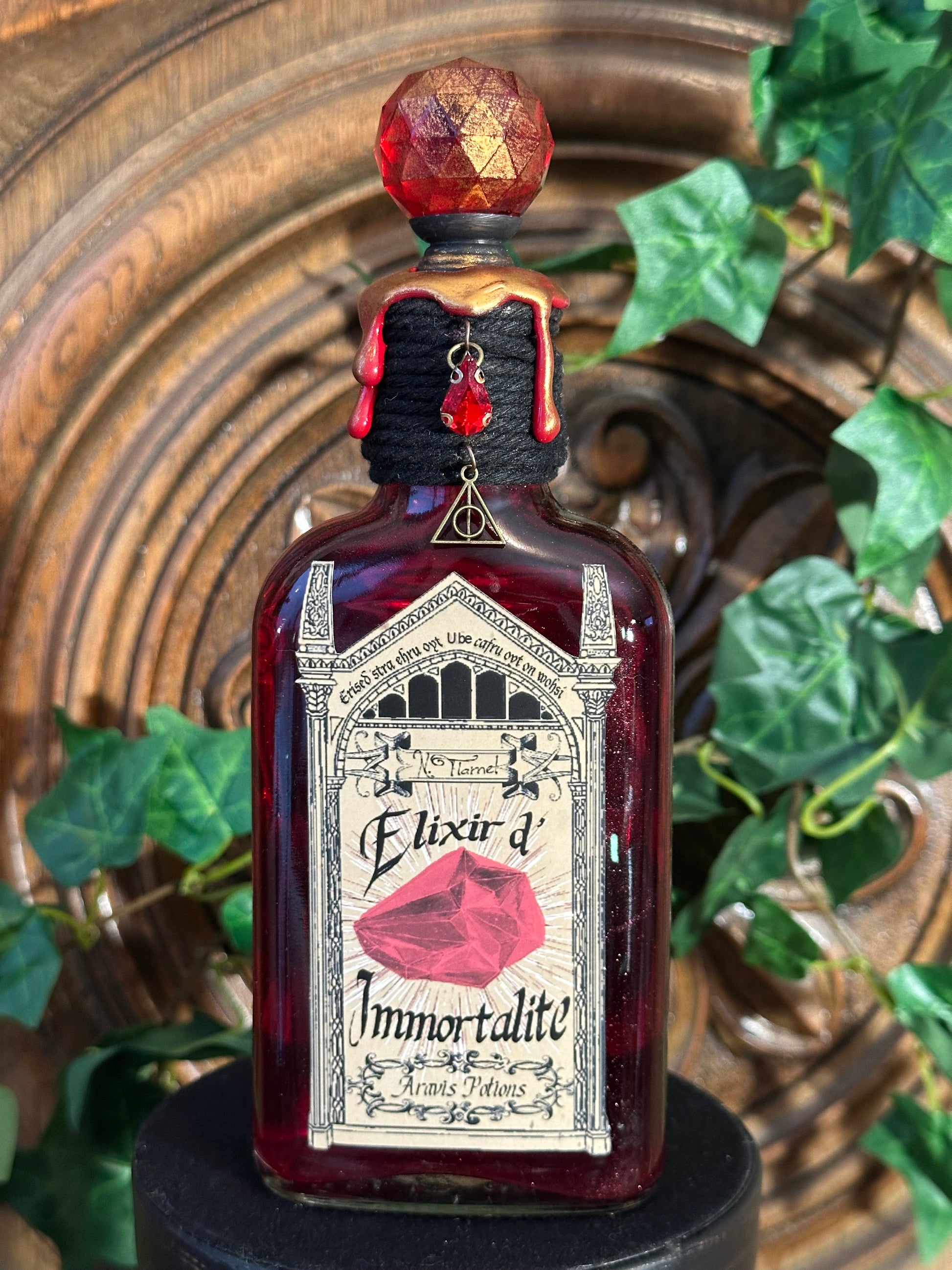 Elixir de Longue Vie, Elixir of Long Life, potion magique de sorcier, Pierre Philosophale, Philosopher's Stone, Nicolas Flamel, Bouteille en verre de décoration, Fiole d’apothicaire, alchimiste.