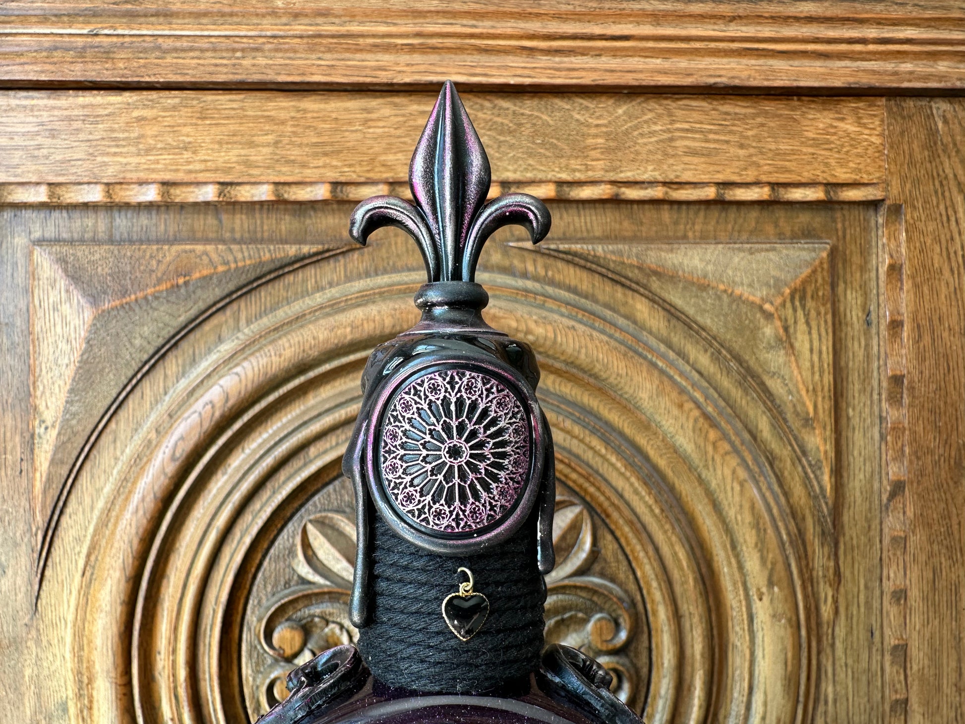 - Un sceau de rosace gothique est fixé sur de la corde enroulée en haut de la fiole.
