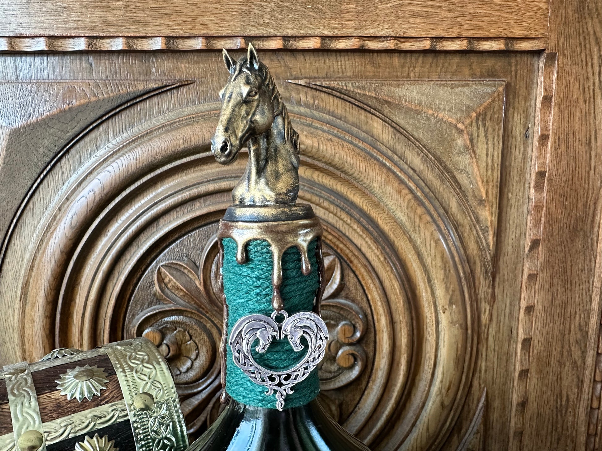 - Un charm celtique métallique de deux têtes de chevaux orne le bouchon et de la corde verte décore le col de la fiole. De la colle marrron dorée scelle le bouchon.