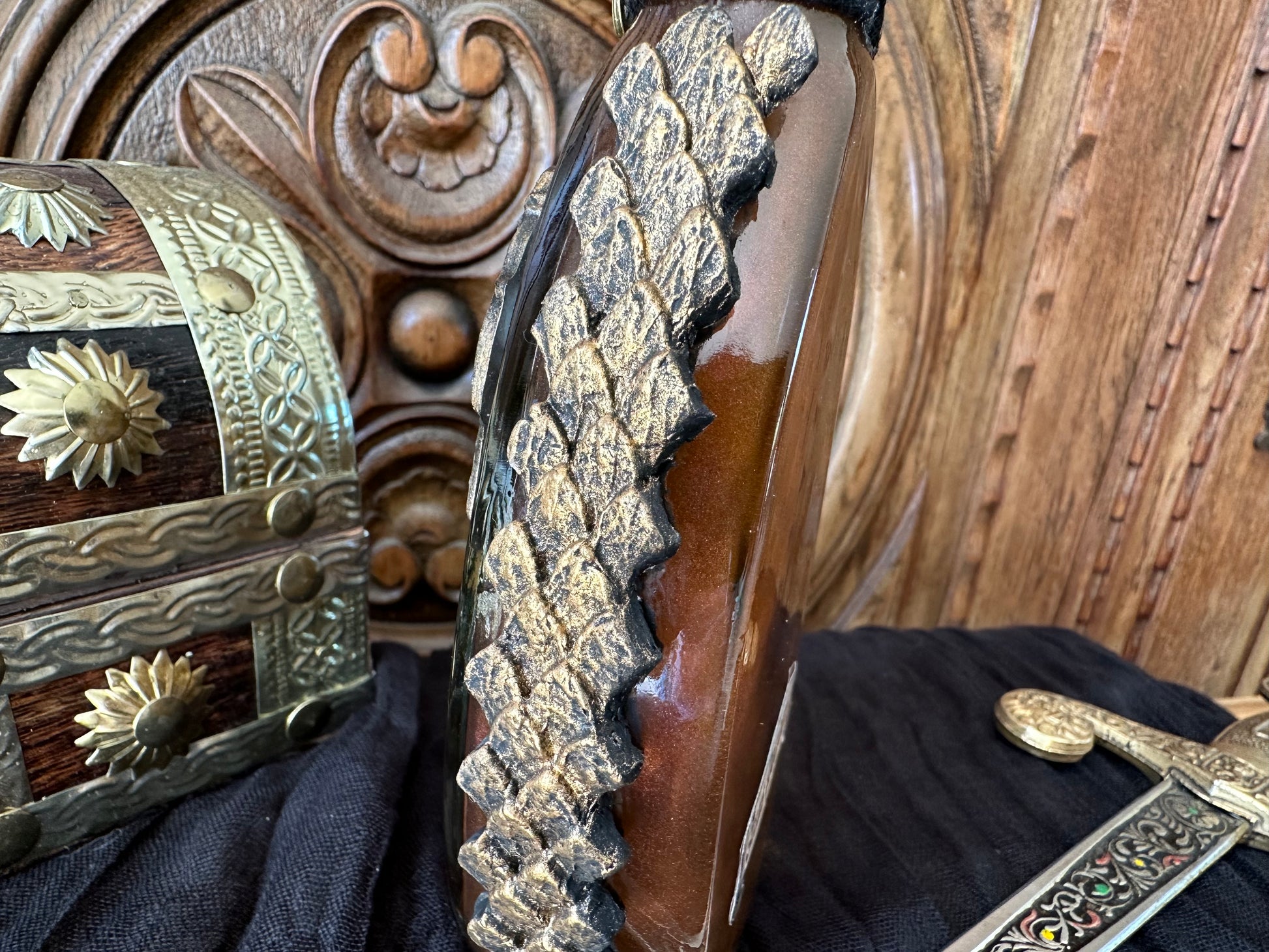 - Des moulures d’écailles ornent les côtes de la fiole et une moulure de dragon orne l’avant.