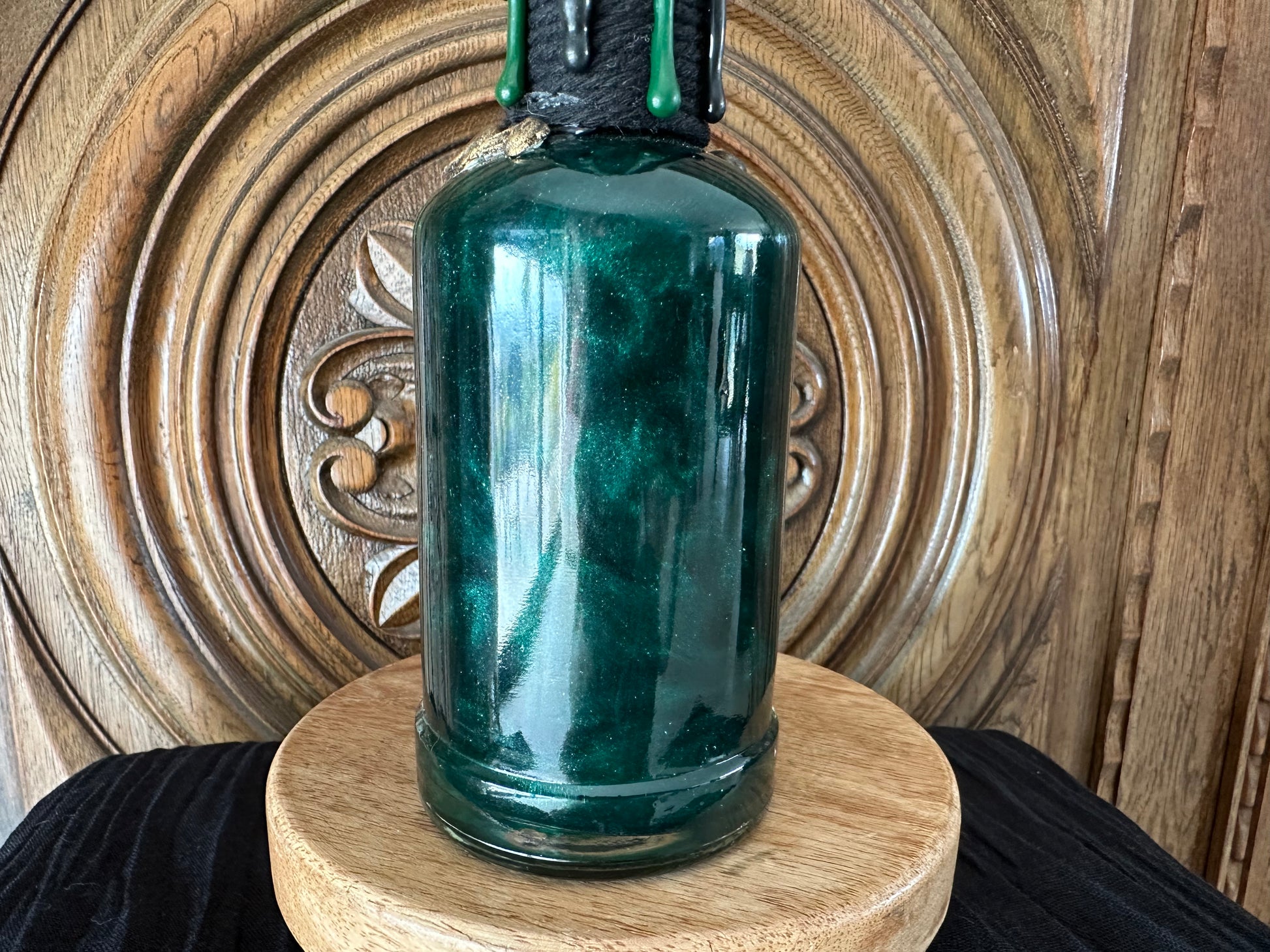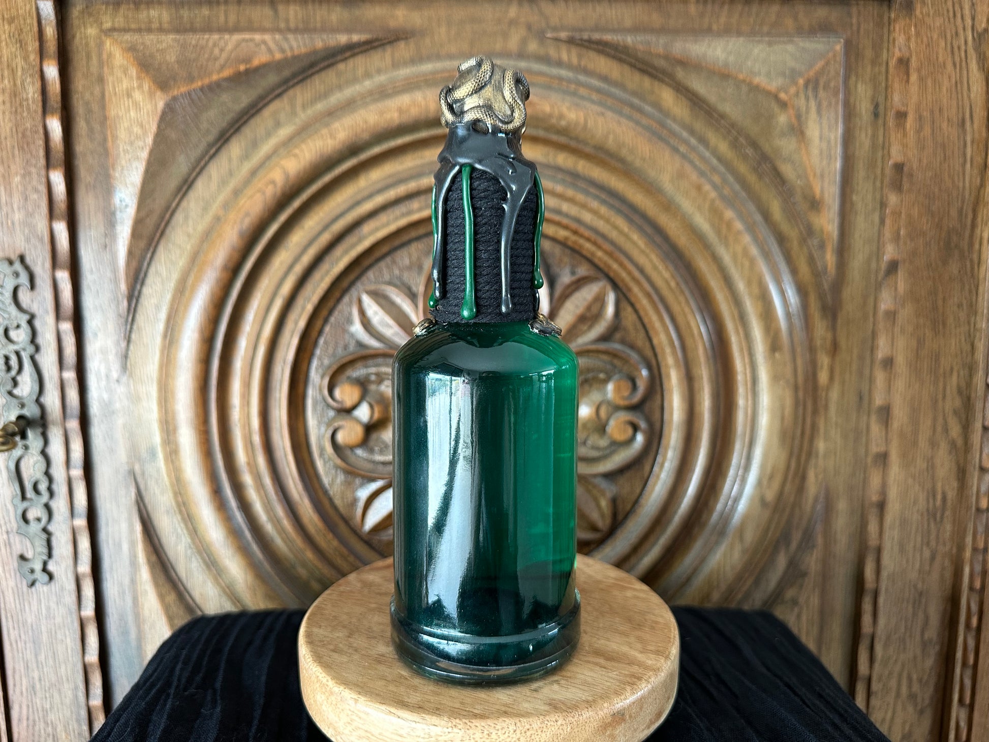 - Un charm tête de mort doré ainsi qu’une pierre orne le col de la fiole et de la colle noire et verte scelle le bouchon surmontée d’un ornement tête de mort à serpents.