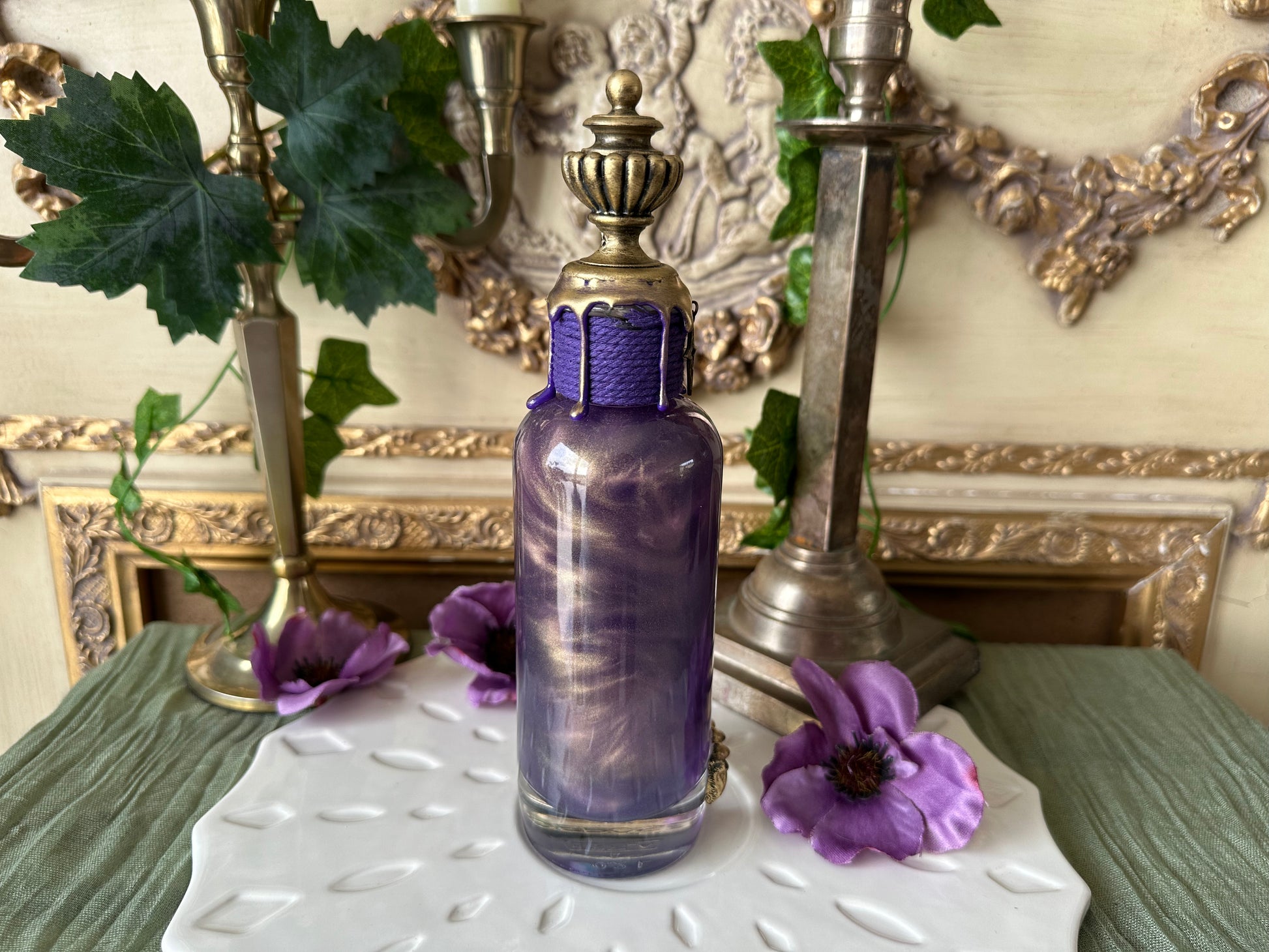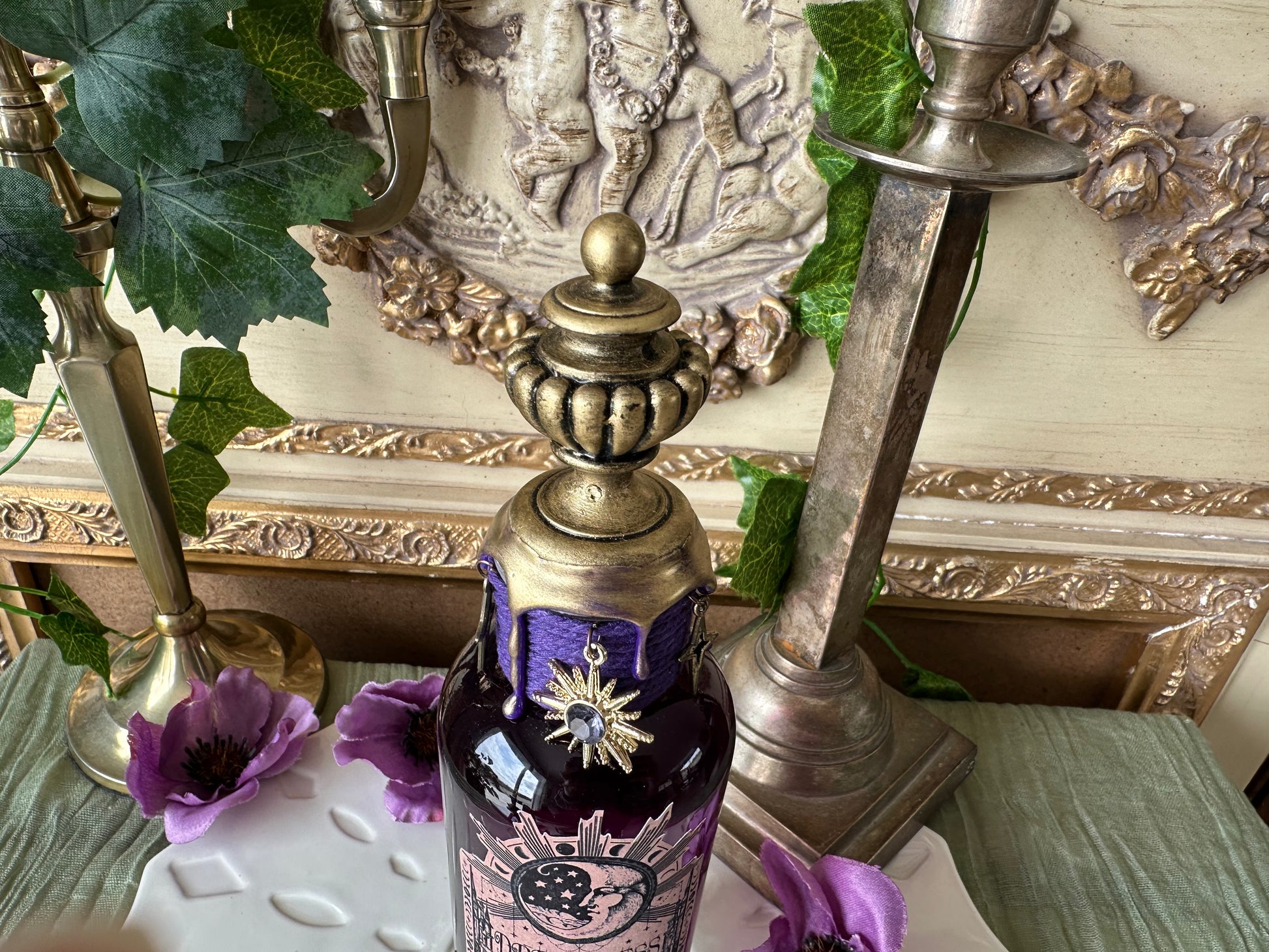 - Des ornements étoilés sont fixés sur de la corde violette enroulée autour du haut de la fiole.