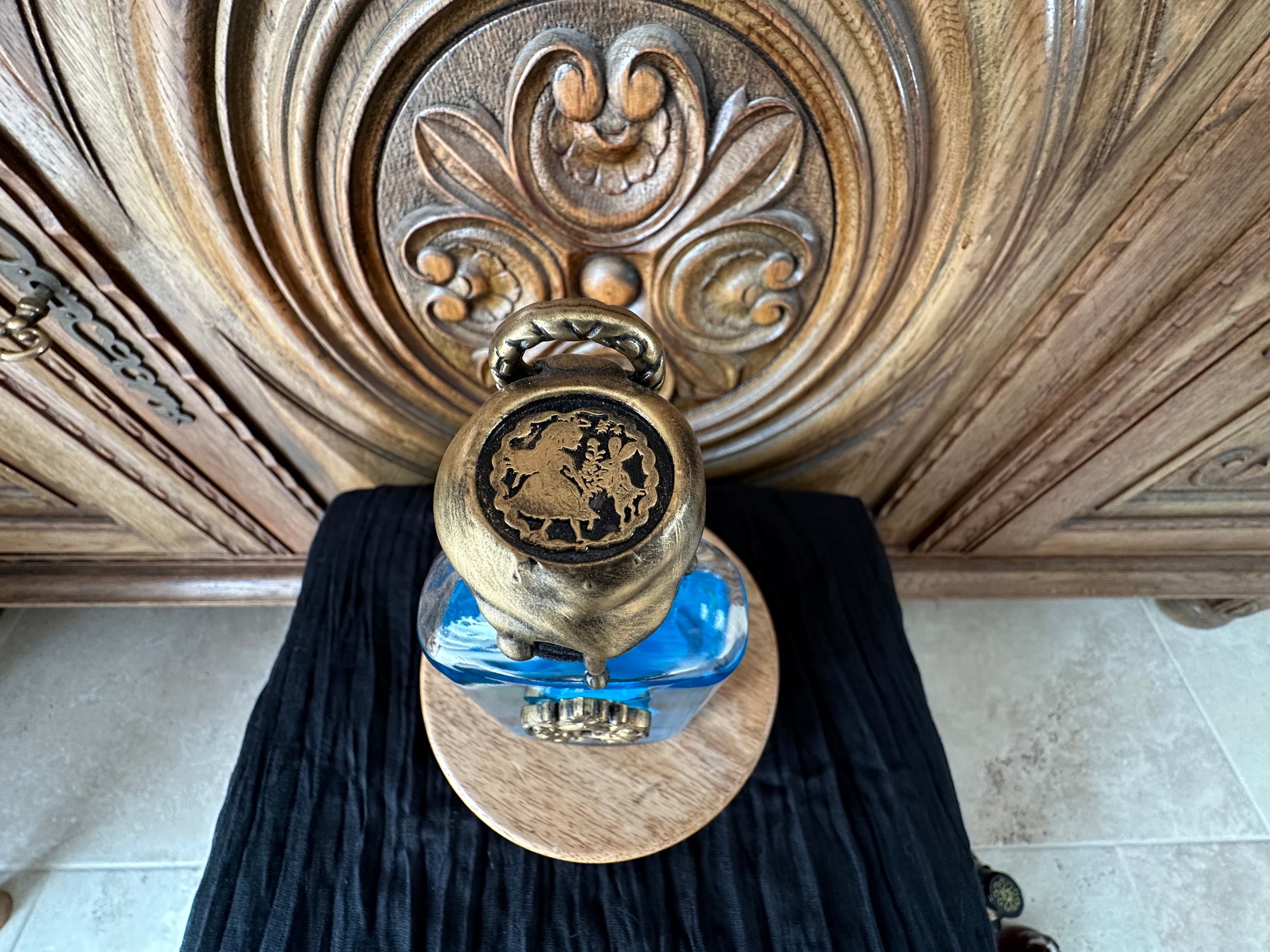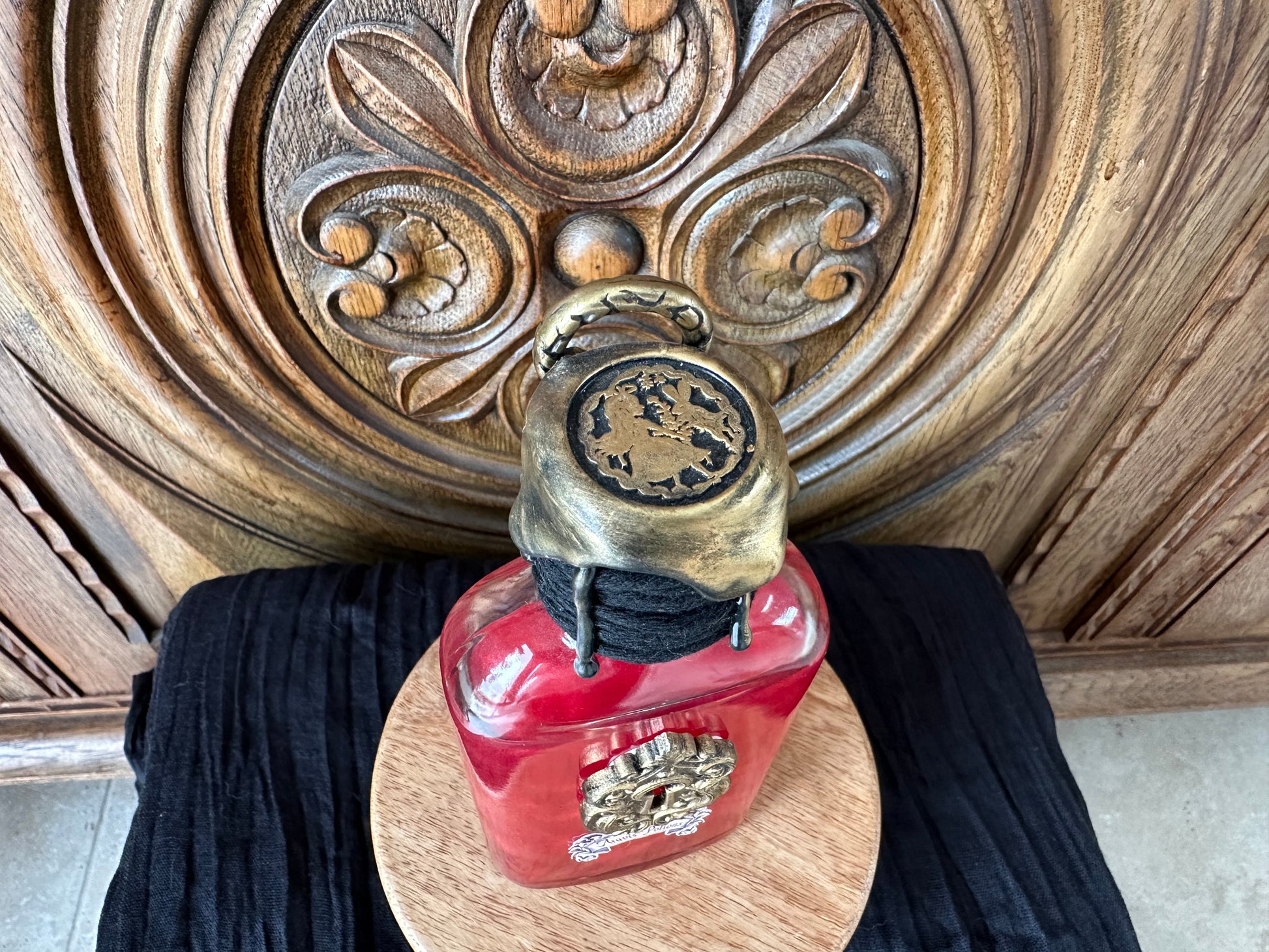 - Un cadre baroque en moulure et peint à la main entoure le sticker à l’avant de la fiole.