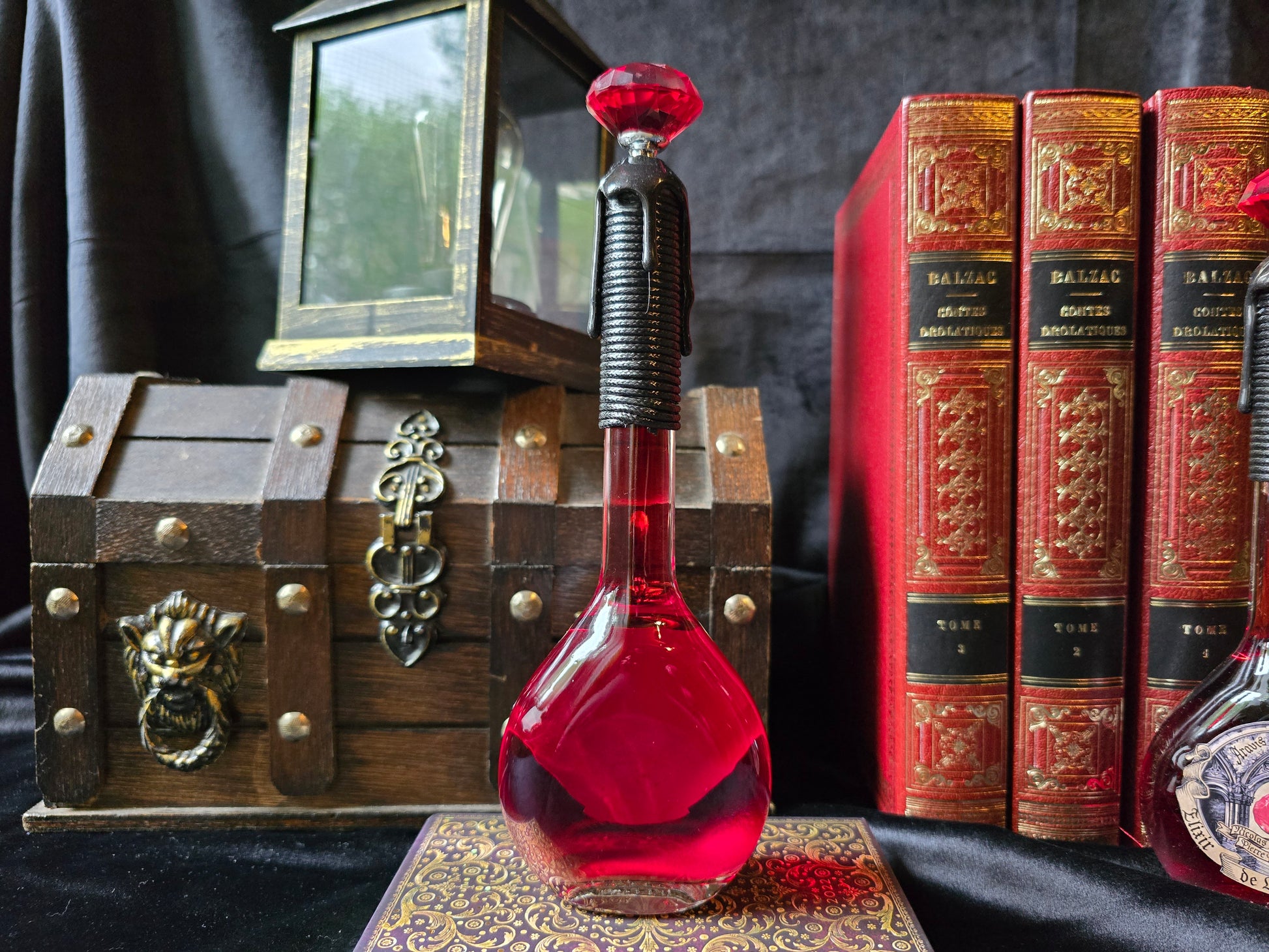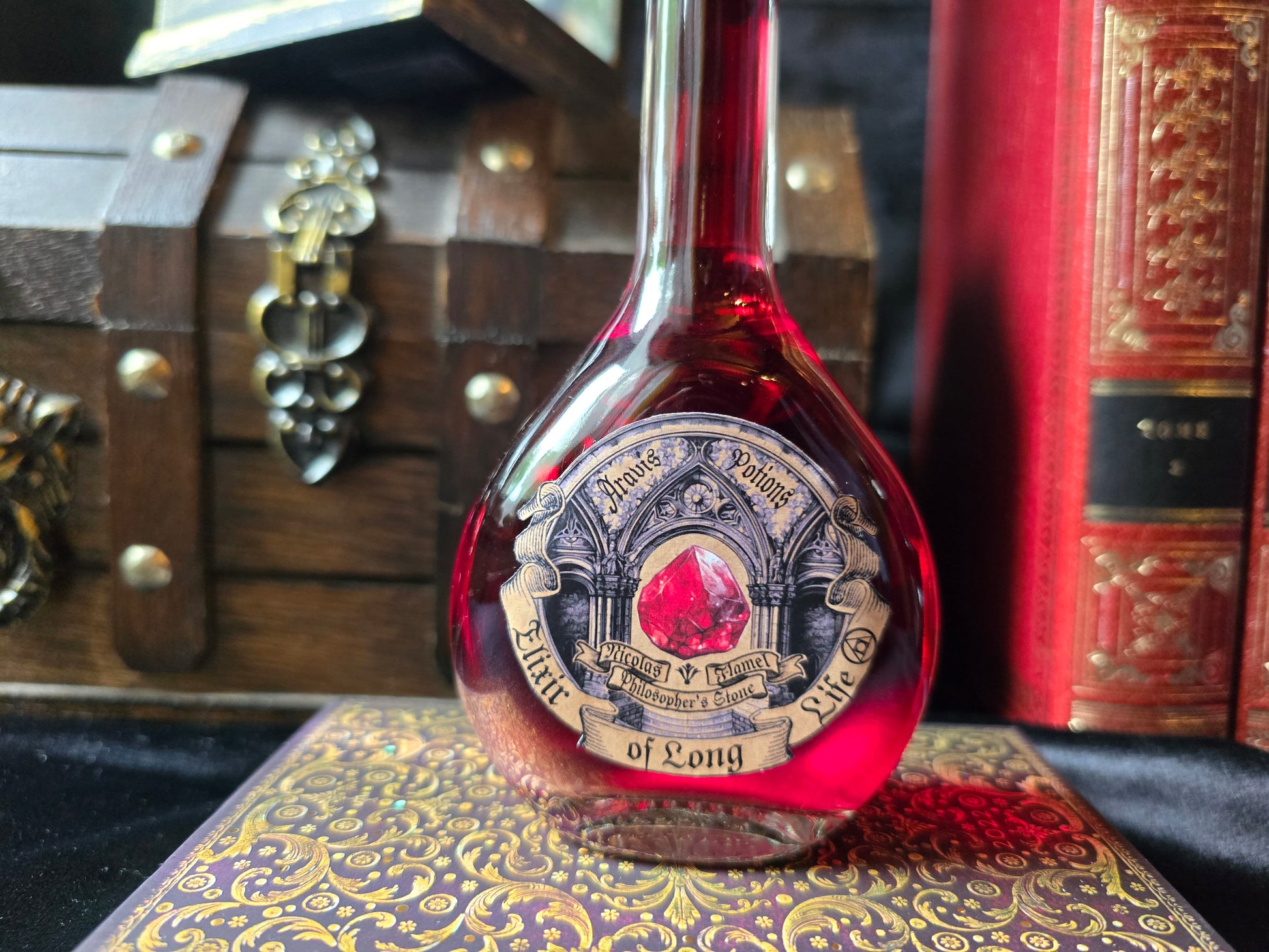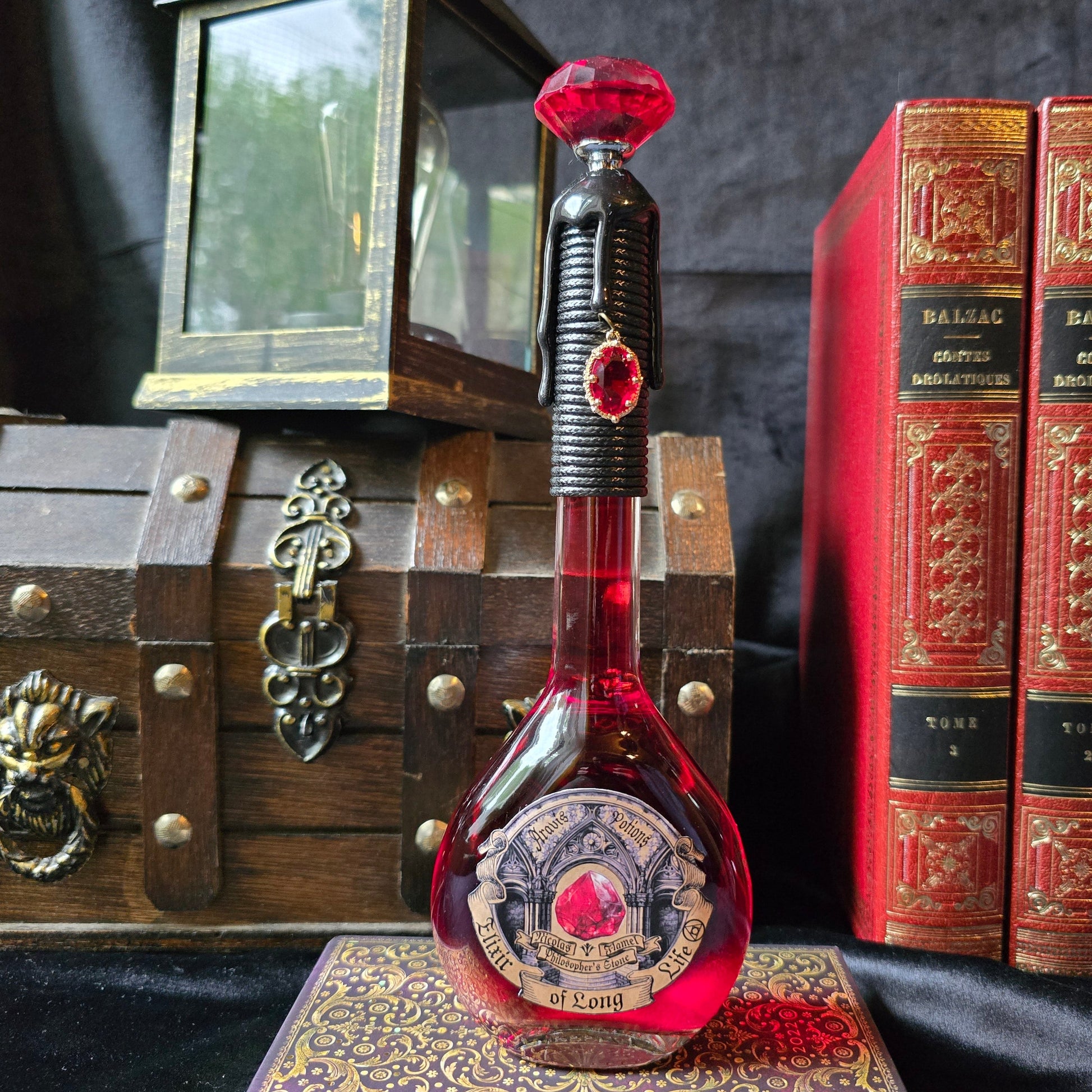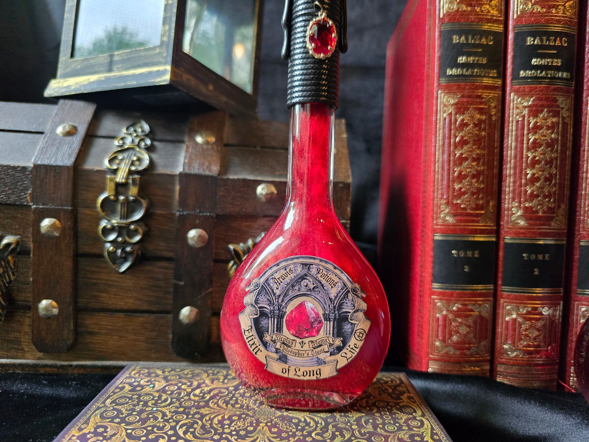 Elixir de Longue Vie, Elixir of Long Life, potion magique de sorcier, Pierre Philosophale, Philosopher's Stone, Nicolas Flamel, Bouteille en verre de décoration, Fiole d’apothicaire, alchimiste.
