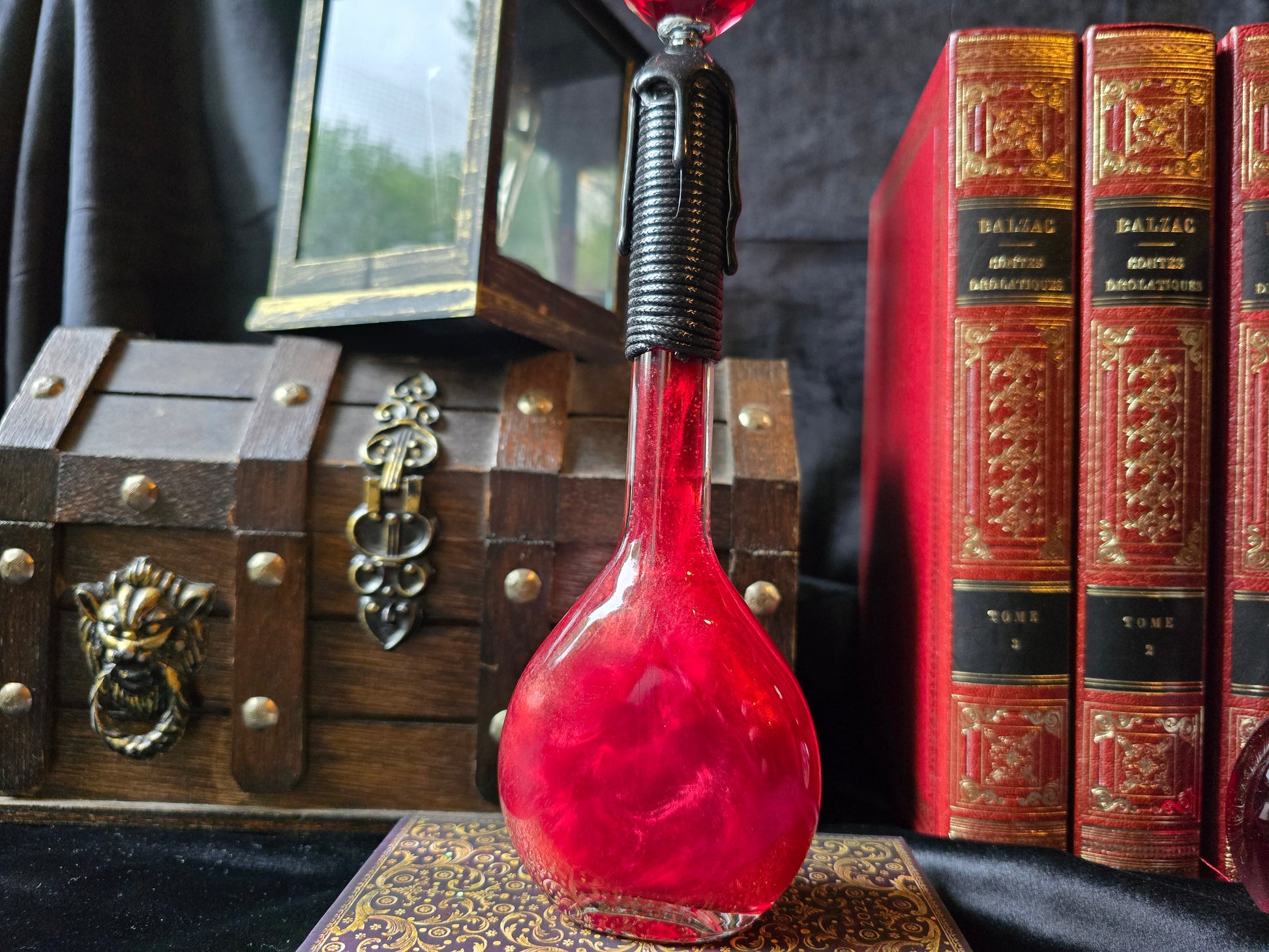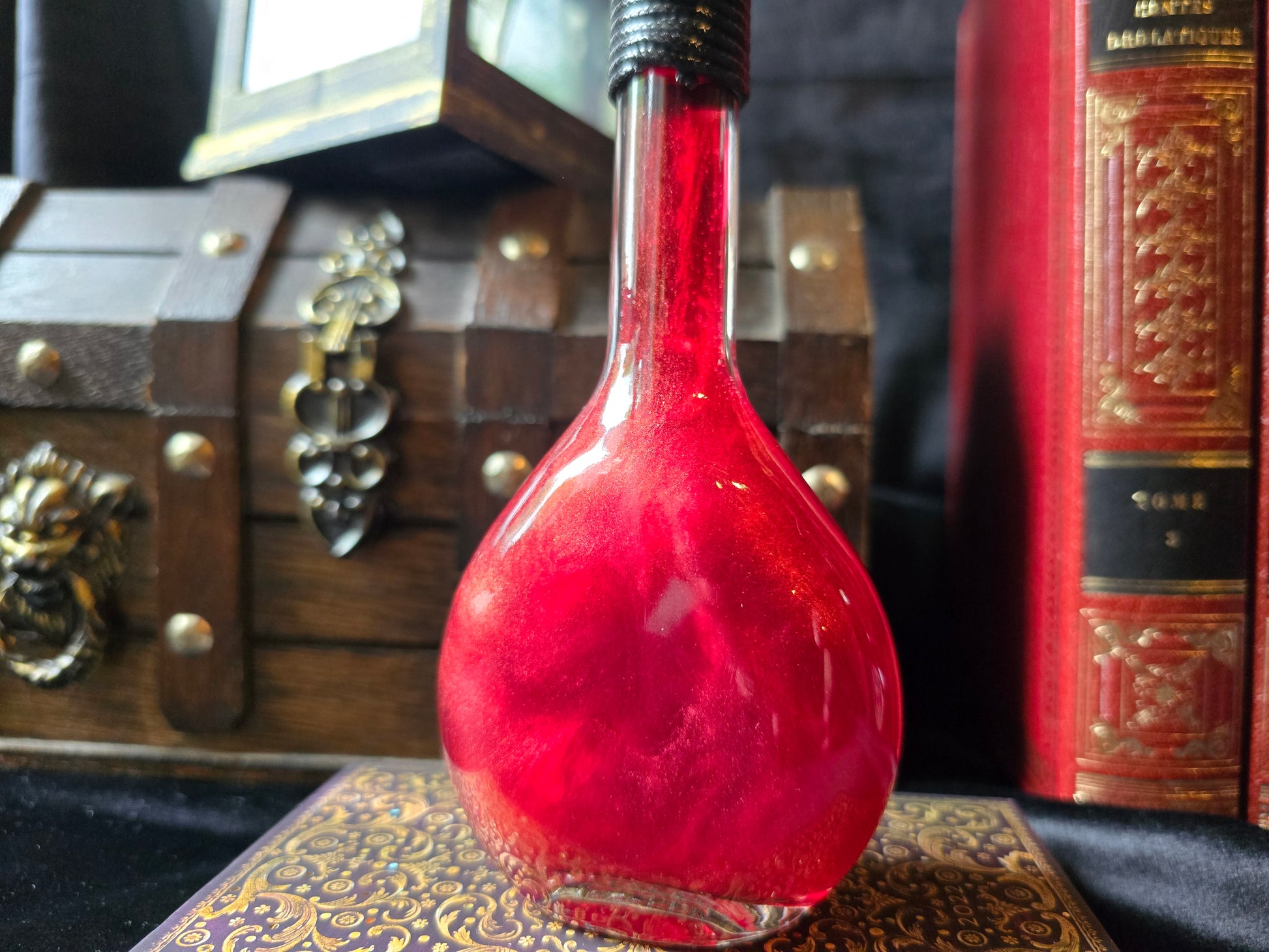 - Le liquide est rouge au repos avec tourbillons effet magique après agitation.