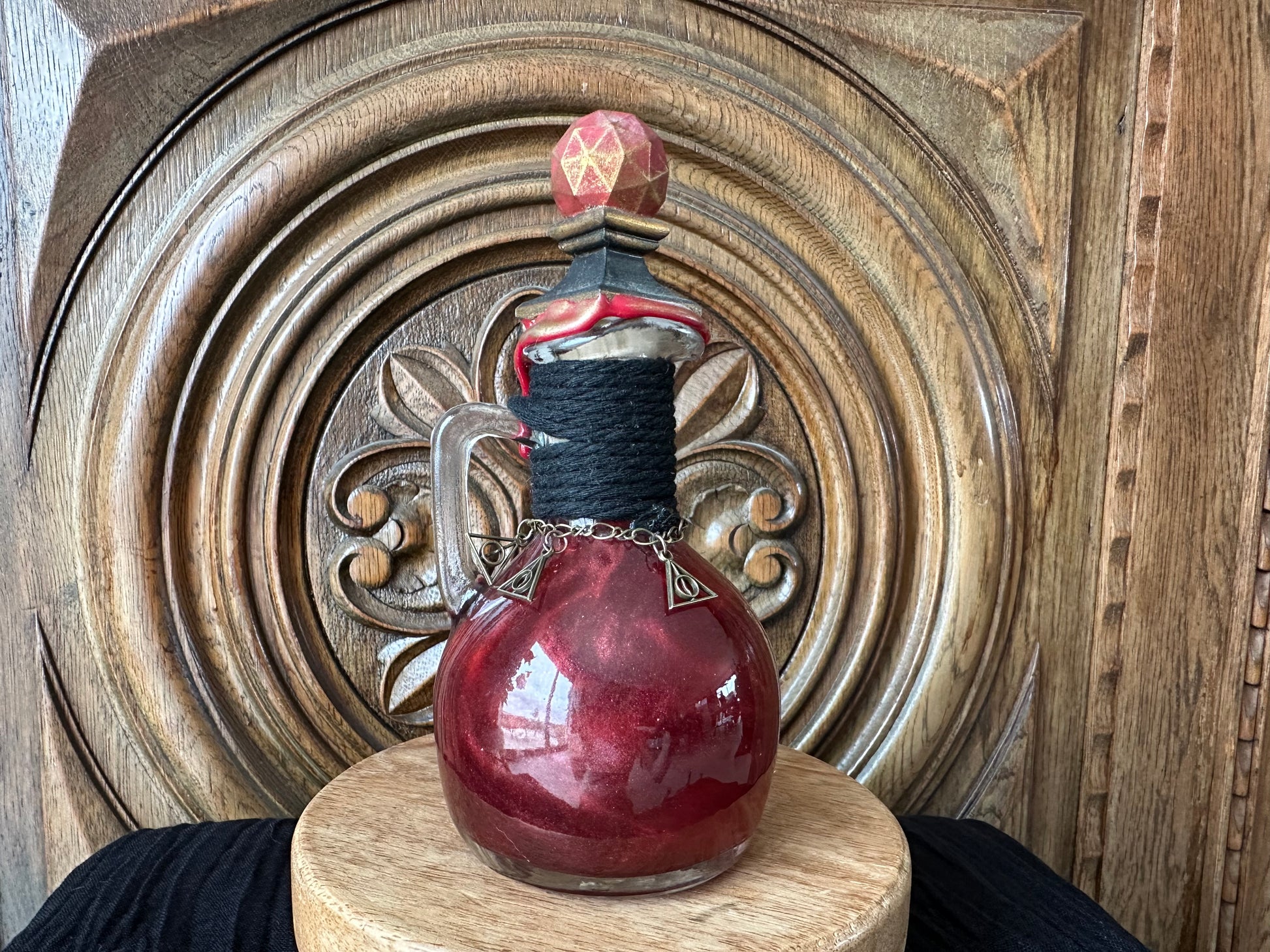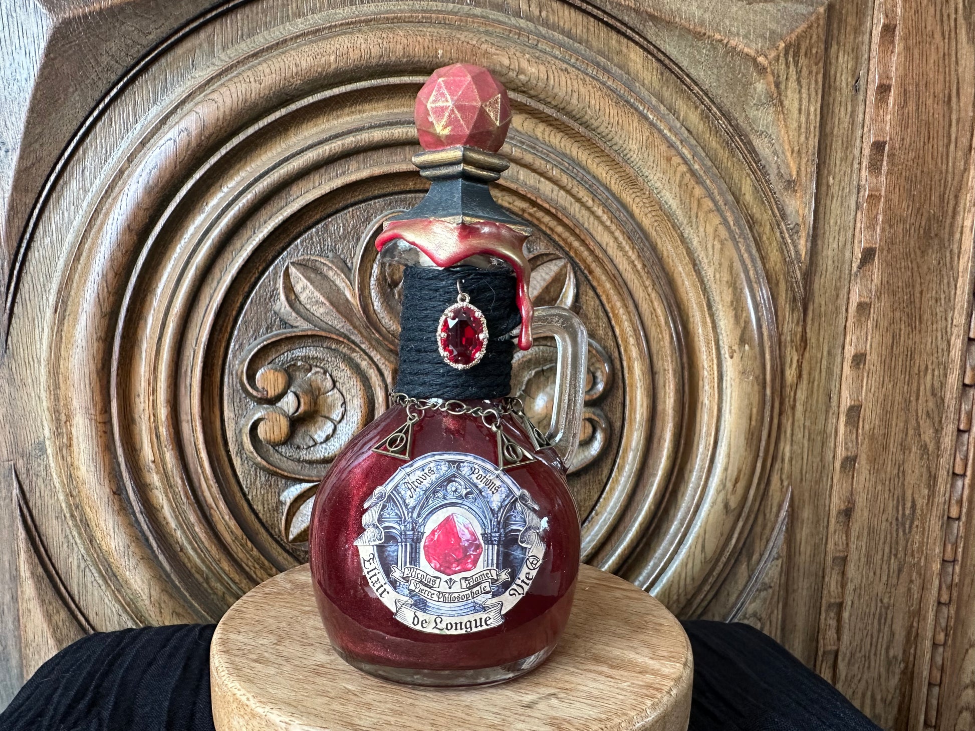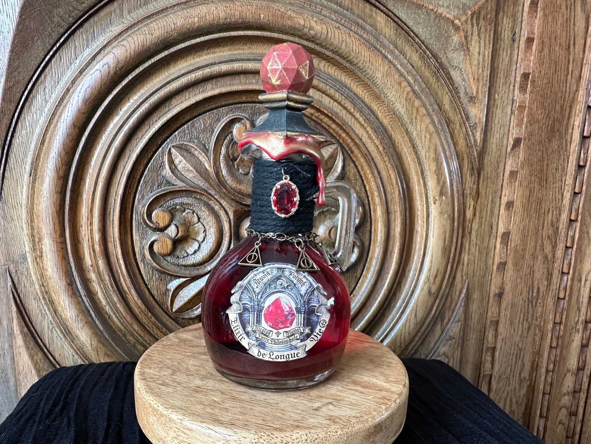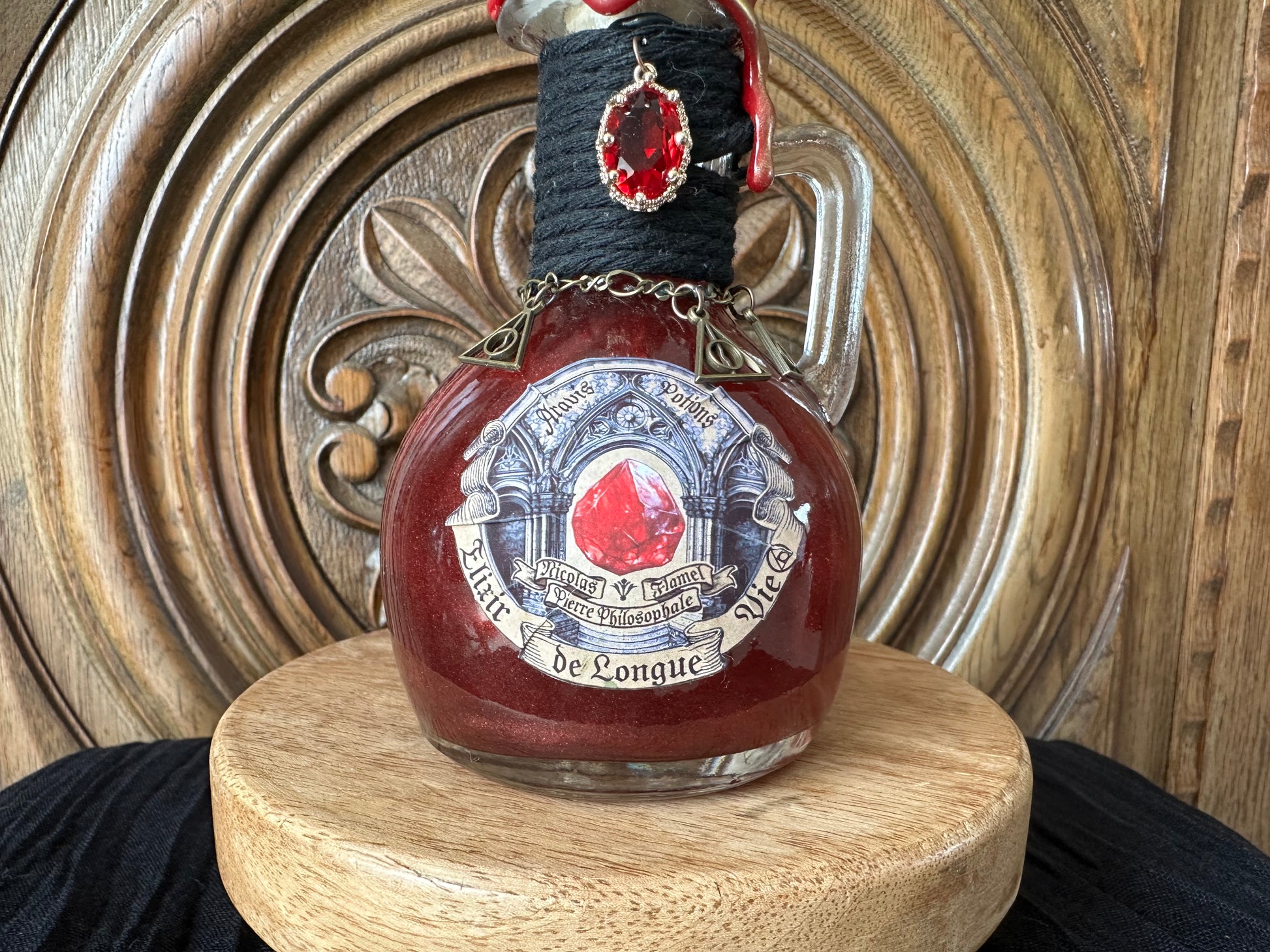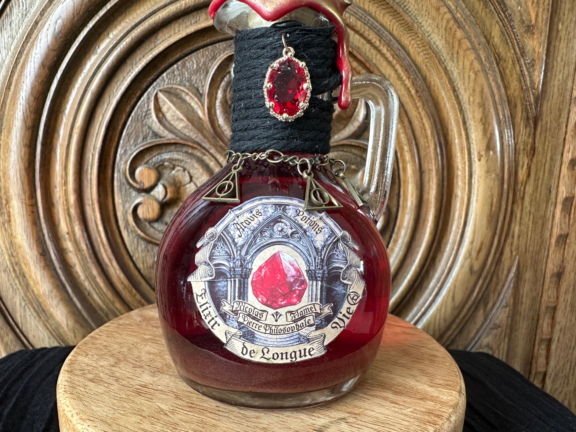 Elixir de Longue Vie, Elixir of Long Life, potion magique de sorcier, Pierre Philosophale, Philosopher's Stone, Nicolas Flamel, Bouteille en verre de décoration, Fiole d’apothicaire, alchimiste.