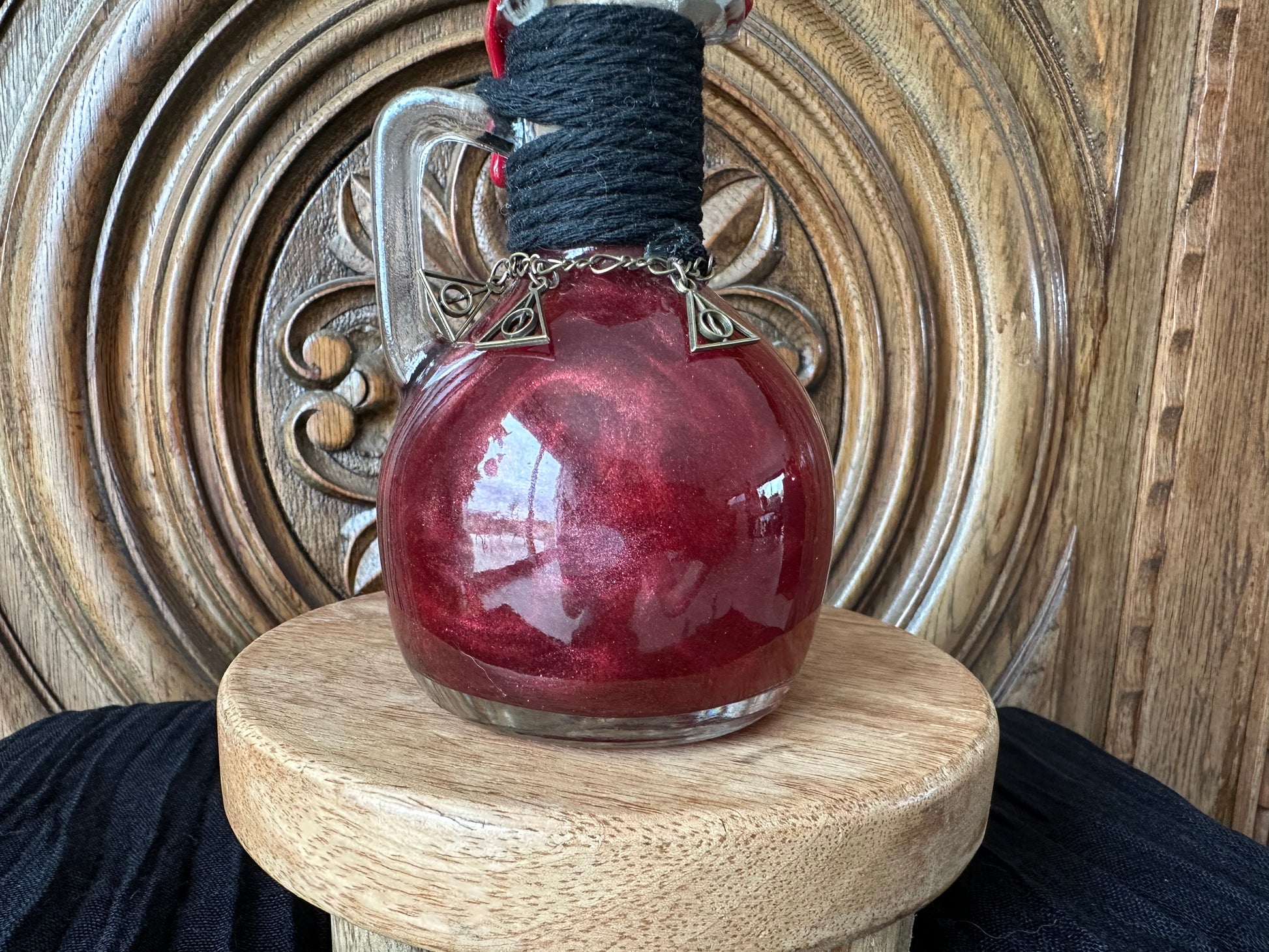 - Le liquide est rouge au repos avec tourbillons effet magique après agitation.