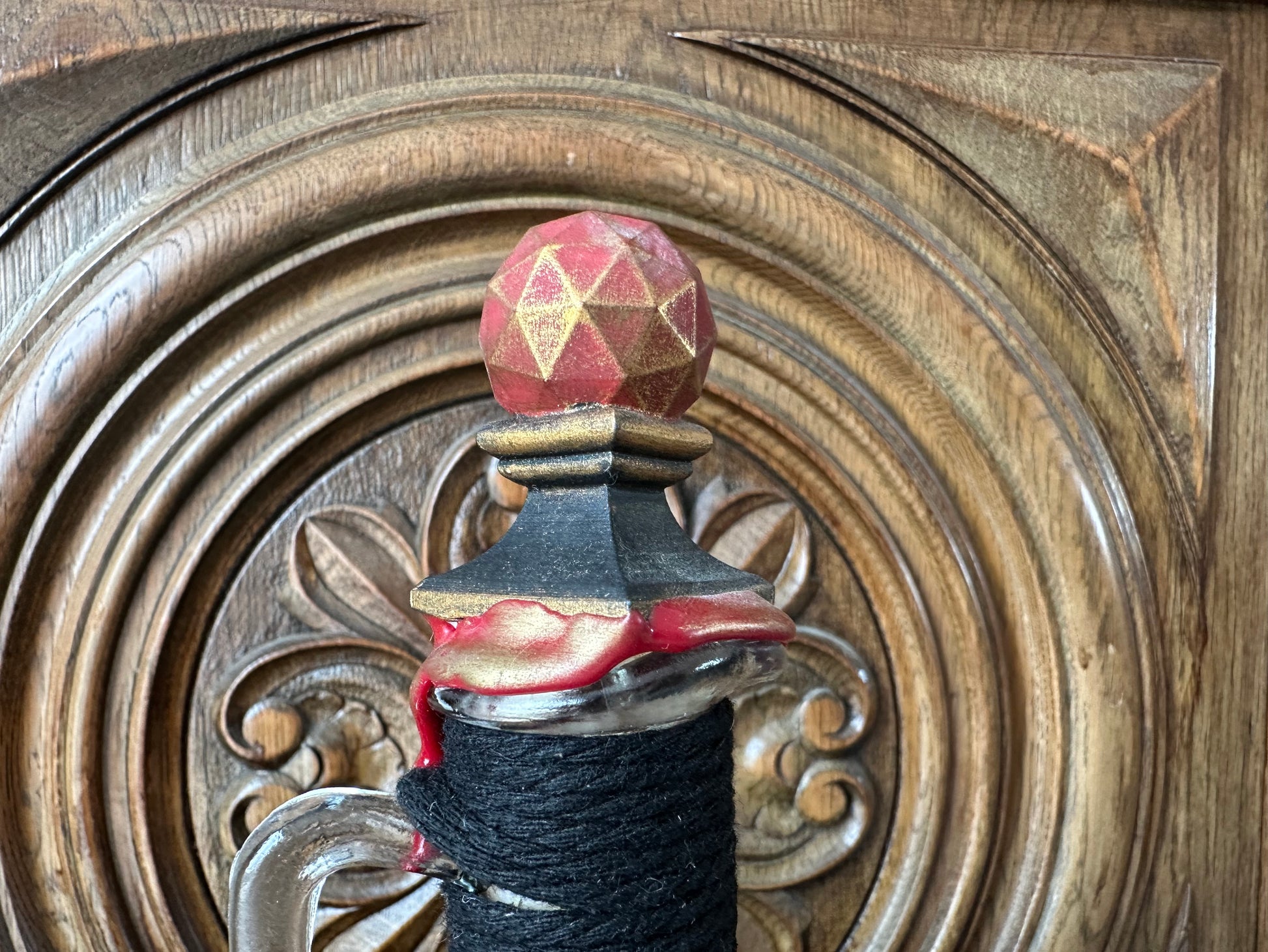 - Un ornement rouge est fixé sur le col de la fiole ainsi qu’une chaîne de breloques.