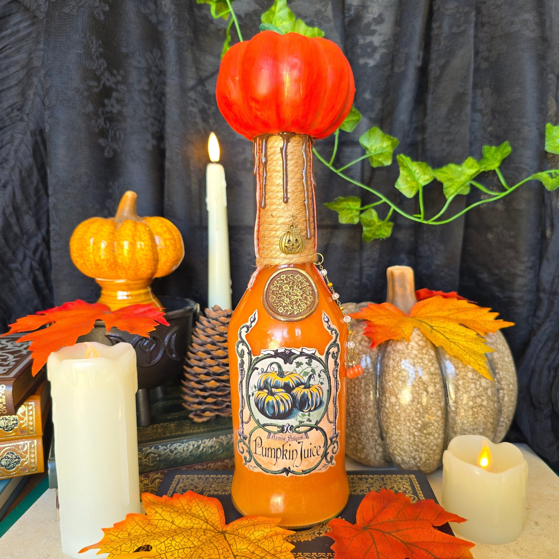 Jus de citrouille DECORATIF, potion magique de sorcier, Pumpkin Juice, Bouteille en verre de décoration, Fiole d’apothicaire.