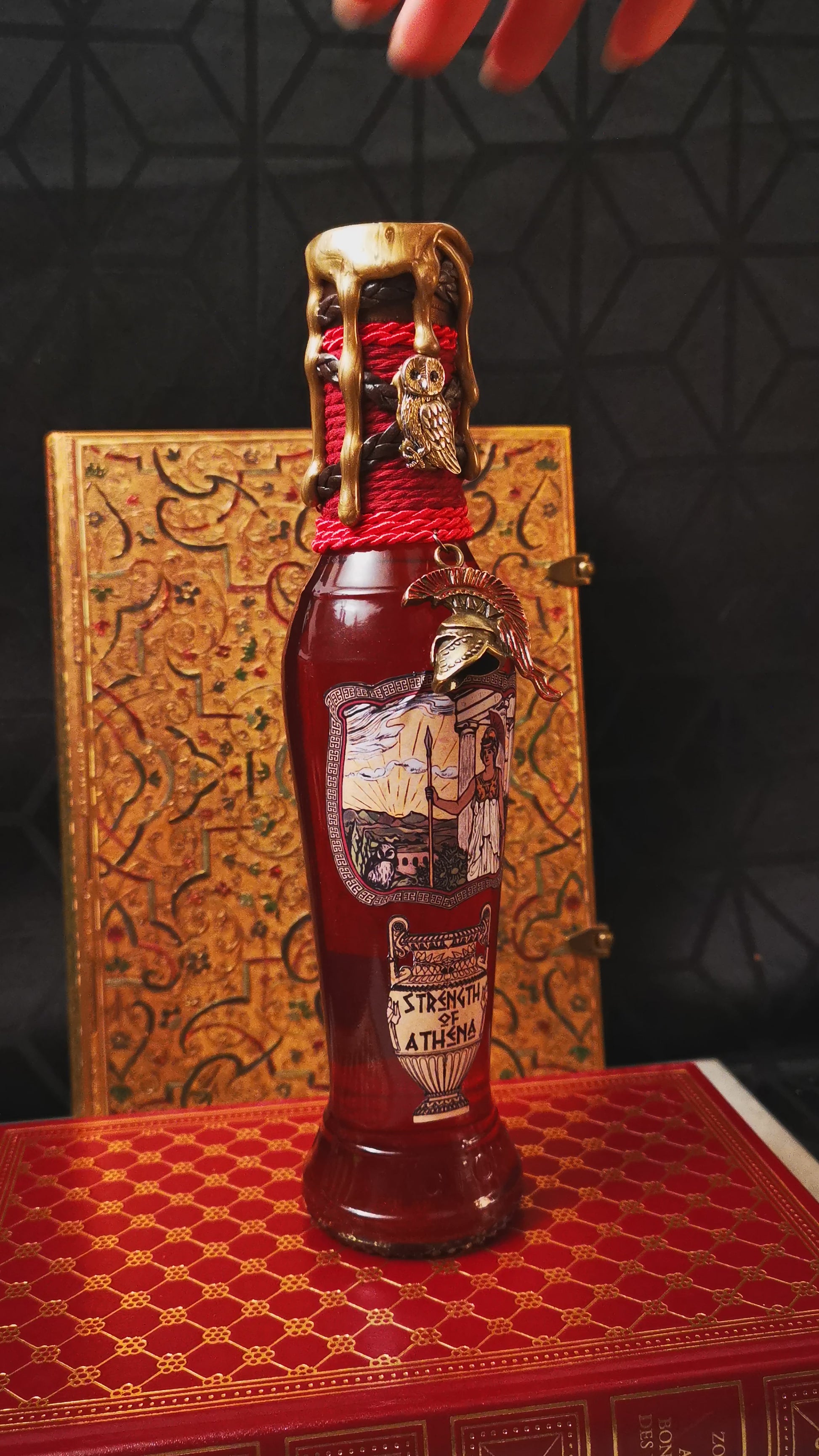 - De la corde rouge et en simili cuir est enroulée autour du haut de la fiole.